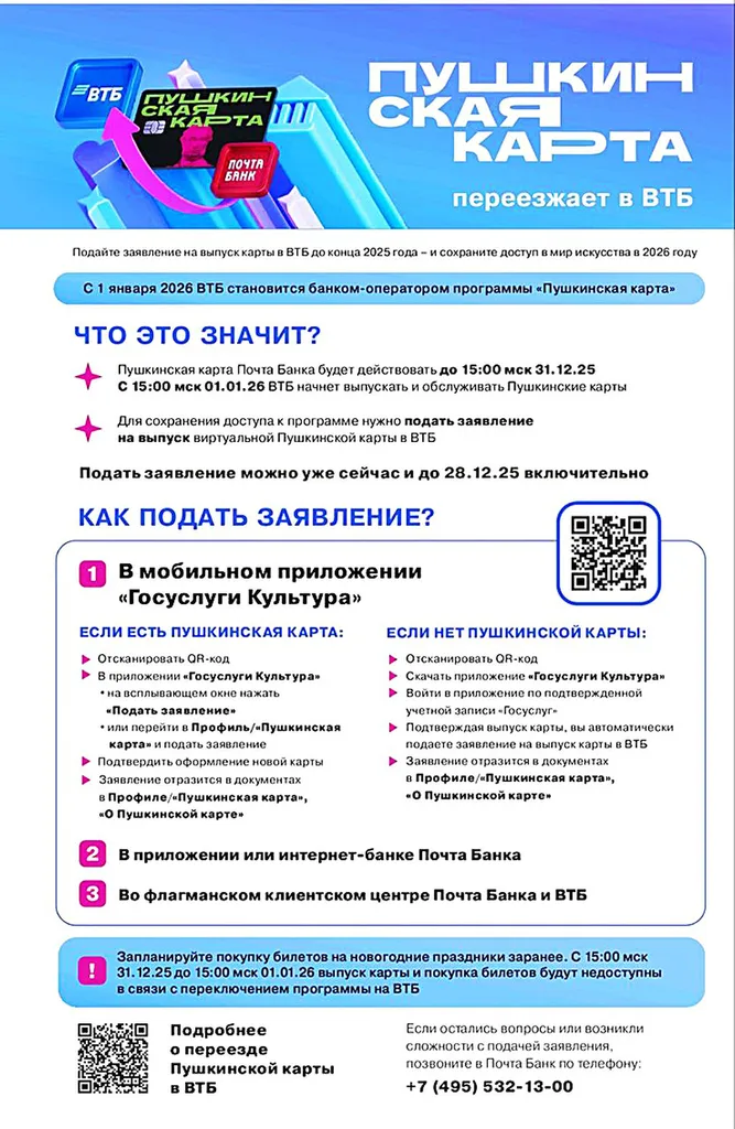 С 1 января 2026 года новым банком-оператором Пушкинской карты стал банк ВТБ.